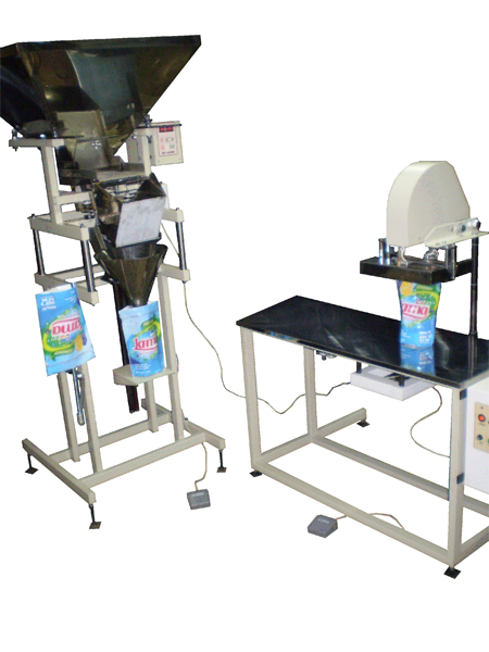 Для упаковки сыпучих продуктов полуавтомат укомплектован весовым тензометрическим дозатором и столом для запайки пакета.